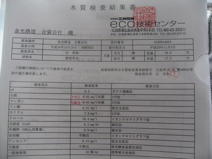 ここで金光酒造の地下水の検査結果をお見せします。